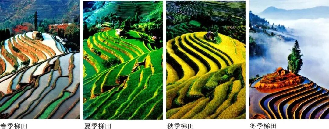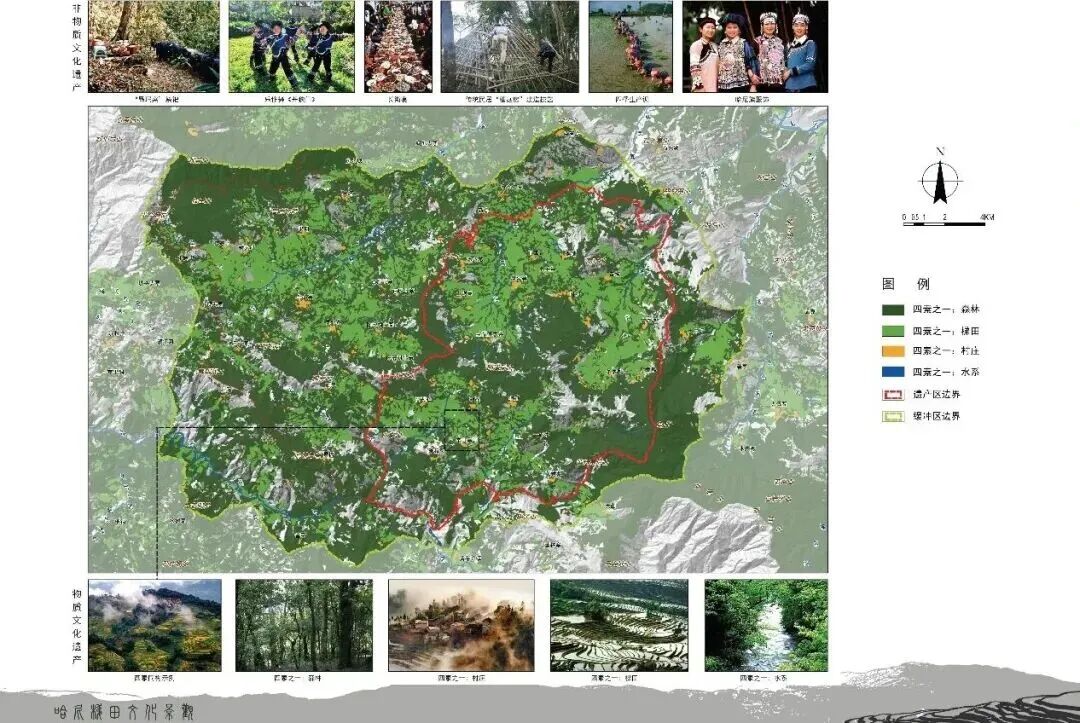 红河哈尼梯田广泛分布在红河州哀牢山南麓的元阳、红河、绿春和金平四县,由物质文化遗产和非物质文化遗产构成。哈尼人民创造的以“四素同构”为核心的完整的农作生态体系,体现出人与环境在视觉和生态上的高度和谐。