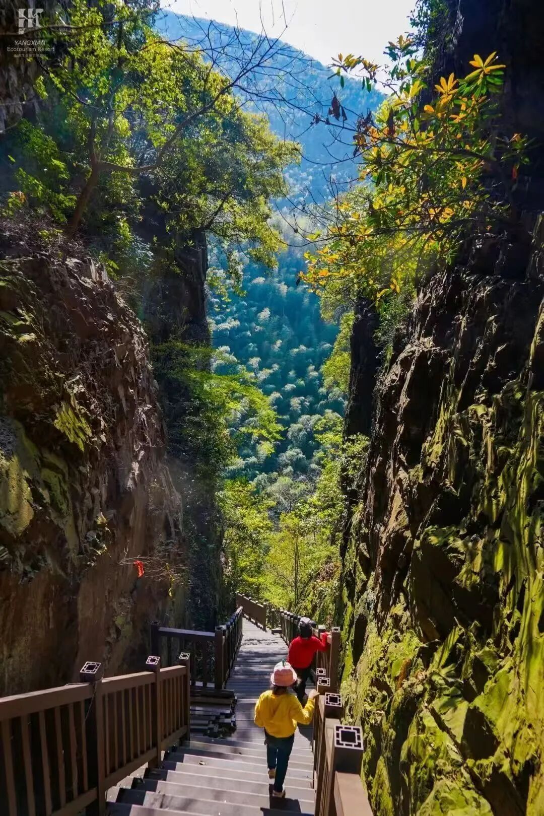 宜兴乾元村森林步道依山势而建,全长约4.5公里,沿途不但可以欣赏由亿万年石灰岩形成的“一线天”奇观,还能远眺千亩茶园、探访高山野生杜鹃花海。