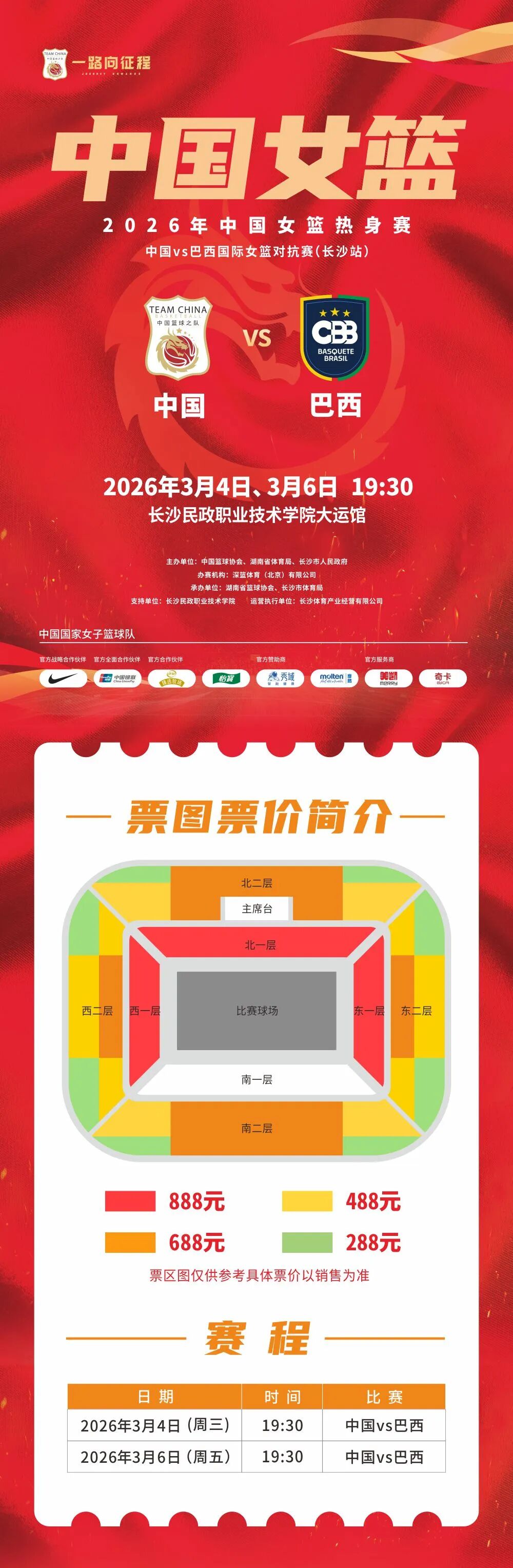 本次比赛的门票目前在大麦网APP、看个比赛、秀动、抖音上都可购买。为满足广大球迷的观赛需求,本次赛事门票特设四档票价,分别为288元、488元、688元与888元。球迷可通过官方指定票务平台进行选购,亲临现场为中国女篮加油助威,共同见证球队的精彩时刻。