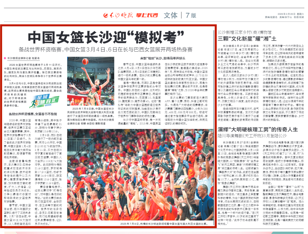 本文刊发于《长沙晚报》2026年2月28日第07版,原标题:中国女篮长沙迎“模拟考”。