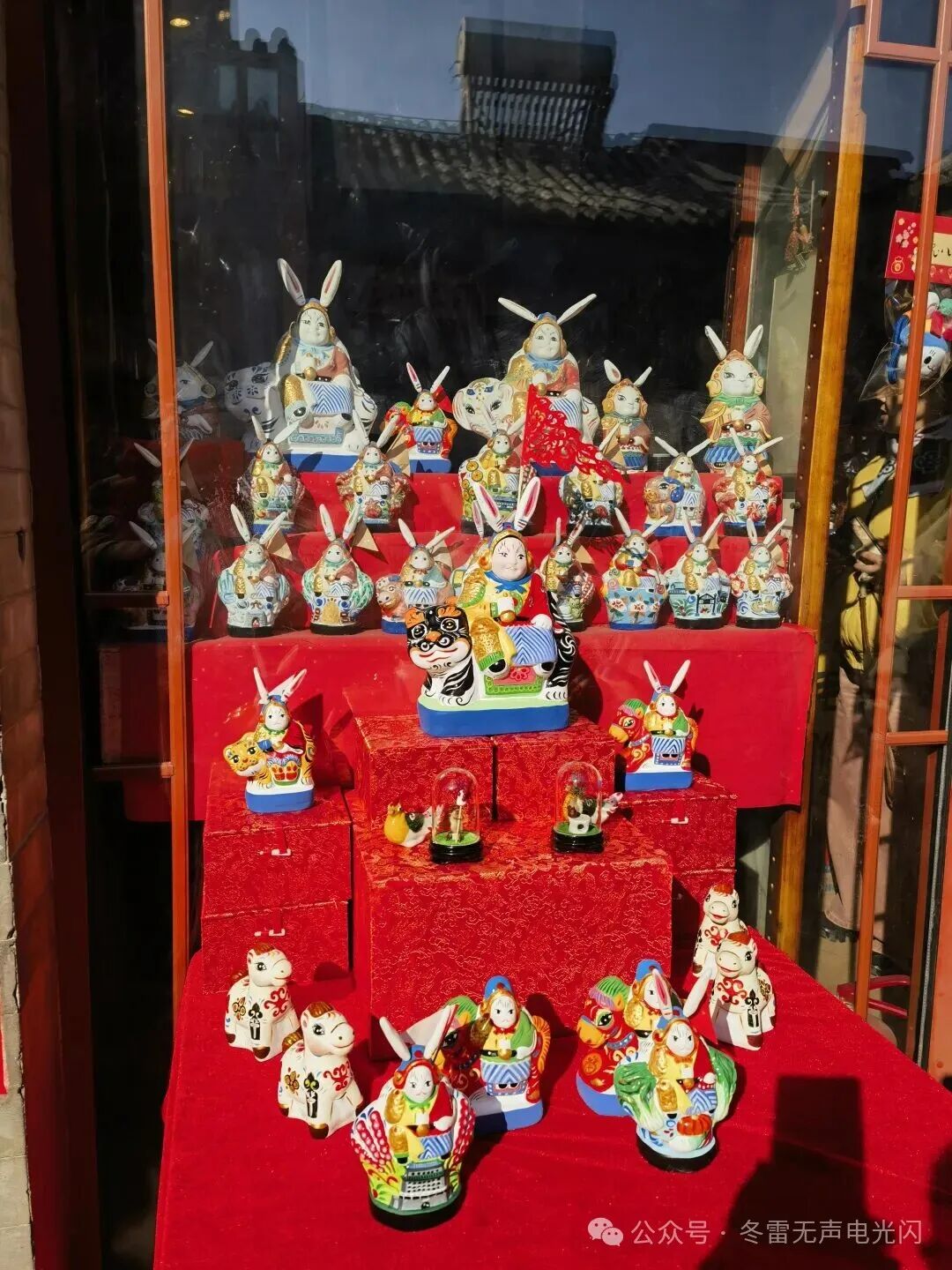 兔儿爷是明代起源于北京的中秋节令泥塑工艺品,原为祭月供品,后演变为儿童玩具。其形象源于月宫玉兔的传说,被视为吉祥、长寿的象征。它以拟人化玉兔为原型,多塑造成金盔金甲的戏曲武生造型,配有虎、鹿、麒麟等坐骑,采用黏土纸浆模塑工艺制作。常见造型包括骑虎、坐山、乘凤等十余种,部分搭配兔儿奶奶形象,清代发展出剃头、推车等生活化造型。