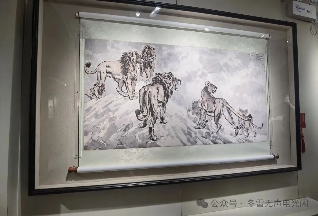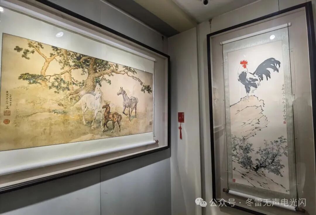徐悲鸿是20世纪中国美术先驱与奠基人,其笔下骏马成为家喻户晓的文化符号,它们或昂首嘶鸣于旷野,或疾驰冲锋于荒漠,充满了一往无前的气势。“四蹄生风不甘后,一尾扬鬃勇向前。与生俱来凌云志,驰骋沙场逐中原。”他打破传统马画的桎梏,以西方解剖透视为骨,以中国水墨写意为魂,创作出“形神兼备”的独特奔马美学。他笔下的奔马,是“一洗万古凡马空”的艺术突破。展出的《三马图》是徐悲鸿早期画马代表作之一。画中3匹姿态各异的骏马,两匹低头饮水、亲密互动,一匹从右侧奔来,形成动静结合的生动场景,体现了徐悲鸿中西合璧的艺术风格。另一幅徐悲鸿1931年创作的《九方皋》,取材《列子·说符》中春秋时期九方皋相马典故,塑造了一位朴拙睿智、胸有成竹的智者形象。画面中央的黑色骏马双目炯炯,前蹄抬起,兴奋地扭头回望九方皋,仿佛在嘶鸣。徐悲鸿笔下的马多为无缰野马,所谓无缰骏马乘风去,直向光明不转身,唯独这幅画中的骏马佩戴着醒目的红缰绳,扭头回望,象征着天下英才“愿为知己者所用”。马鬃飞扬、四蹄腾空的瞬间被定格在画纸上,近看能清晰感受到笔触的动感,以及一笔一墨间蕴藏的生命律动。