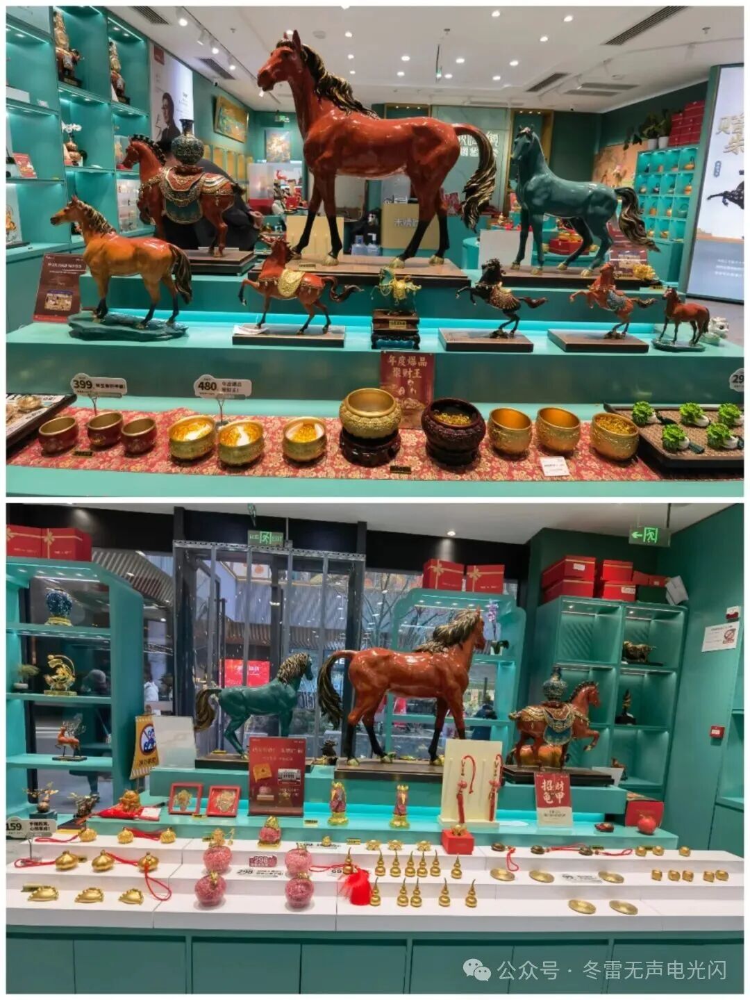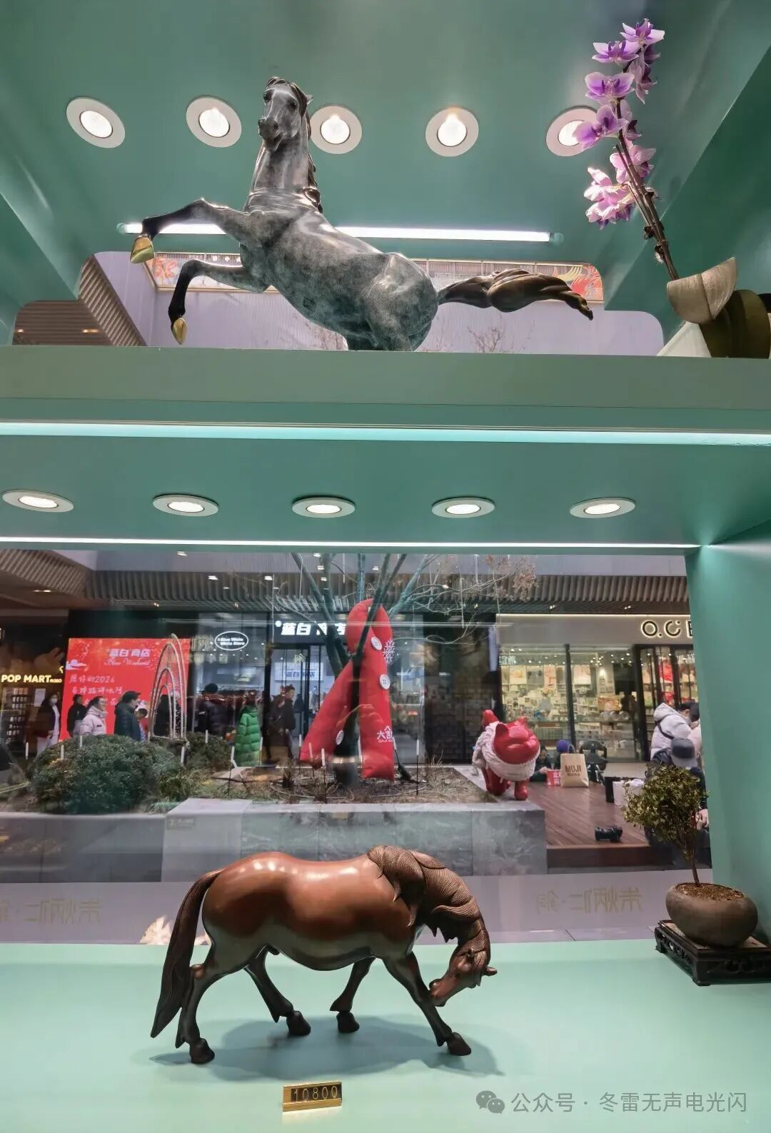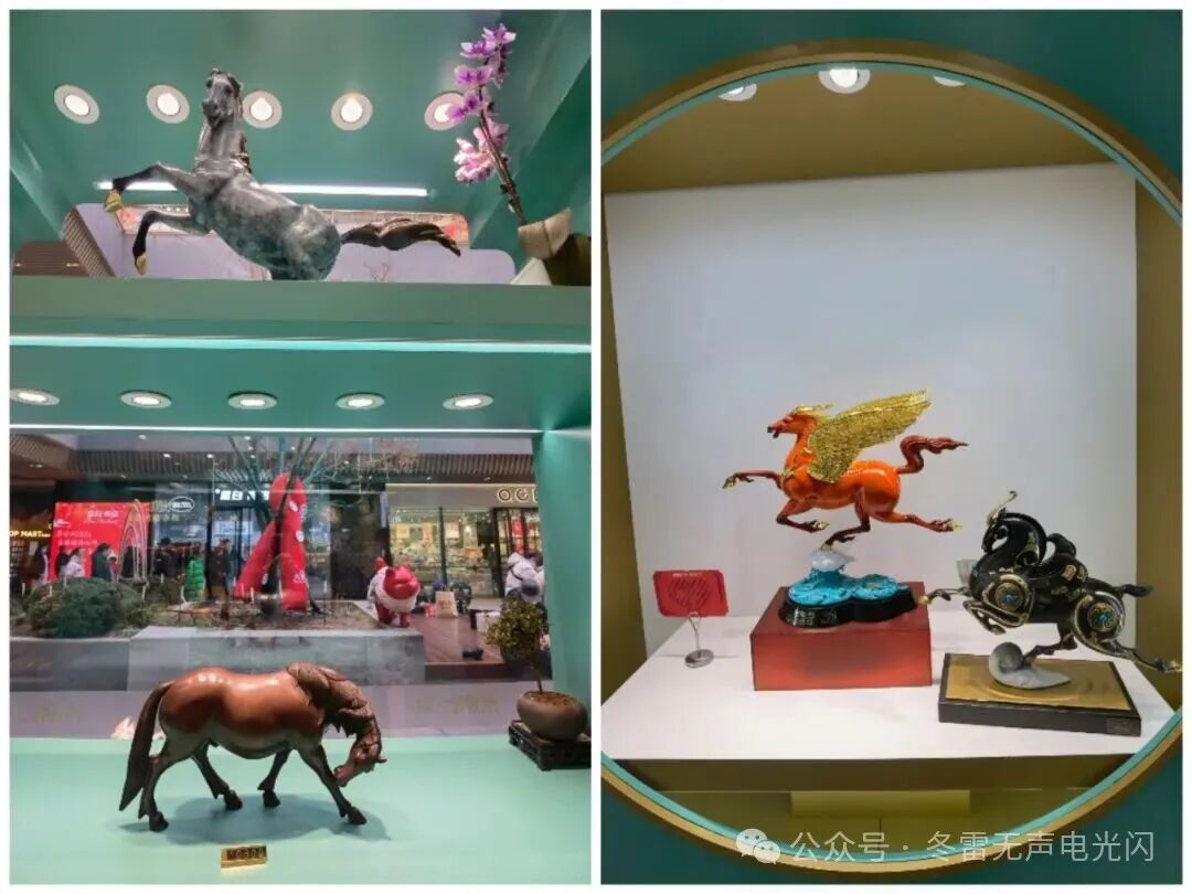 之前参观过朱炳仁铜艺的前门店和北京嘉德拍卖中心的展览,大吉巷这家店配合马年新春,更突出了马元素,龙马飞腾、八骏飞奔、马踏飞燕、霓裳天马、马富贵……呈现万马奔腾迎新春之势。既有气势恢宏的大型铜马装置,也有精致小巧的文创作品。