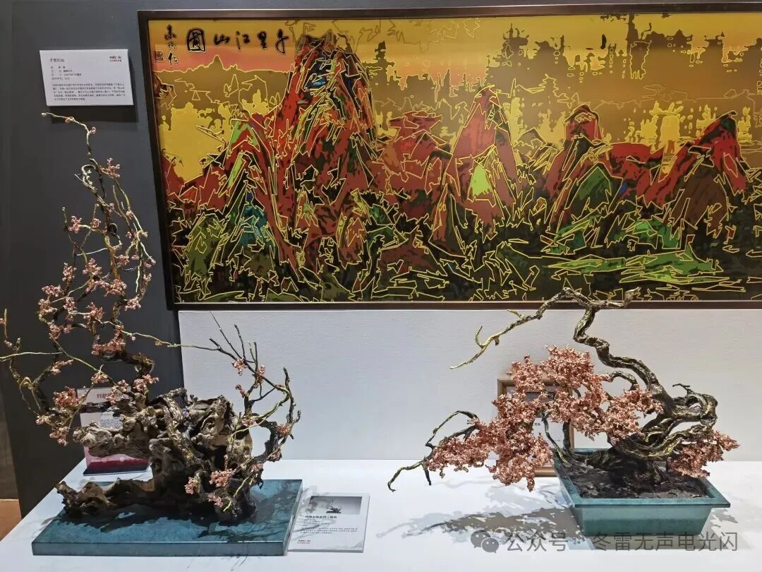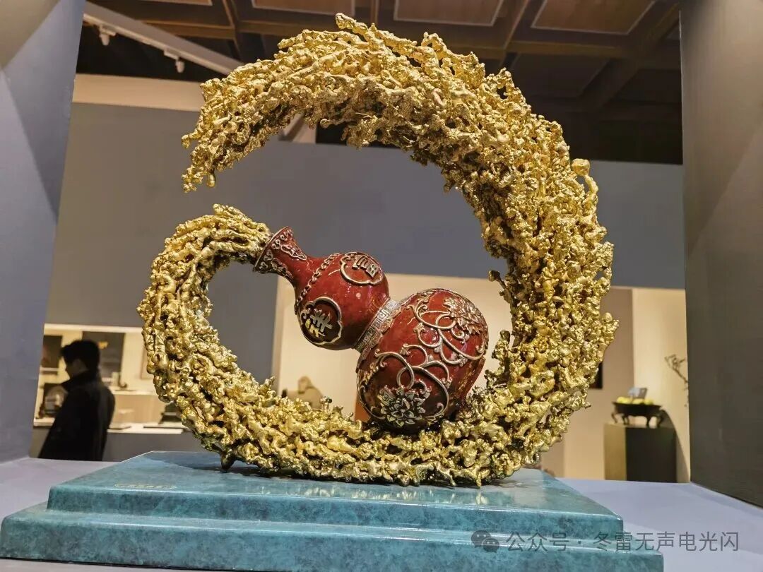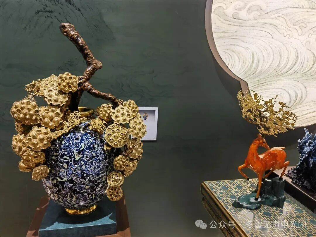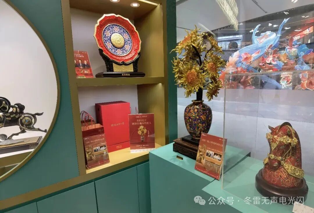 走进朱炳仁铜艺店,仿佛踏入一座灵动的“铜马王国”。店内陈列了各种精美绝伦的铜器作品,有铜器艺术品、摆件、茶具、车挂等等大大小小的品类,琳琅满目,美轮美奂,令人目不暇接。许多人只见过“千里江山”画卷,没想到在现实中还能见到用熔铜技法重构的传统山水意境,造型壮丽秀美。燃烧的向日葵,正如它的名字一样,以烈焰般的姿态,在灯光的衬托下展现出一种流动的金属感,使梵高的画在铜的世界里得以浴火重生。荷风常盛·中国禧,是一带一路的外交艺术品,用铜和景泰蓝跨界牵手,寓意锦绣中华。莲年如意,是花瓶形状的铜器,瓶身上有立体莲花,象征喜庆和生生不息。铜雕技艺与花丝镶嵌“双非遗”打造而成的“九运中国鹿”,体态丰盈优雅,四肢矫健有力,素雅中又凸显几份庄重华丽。