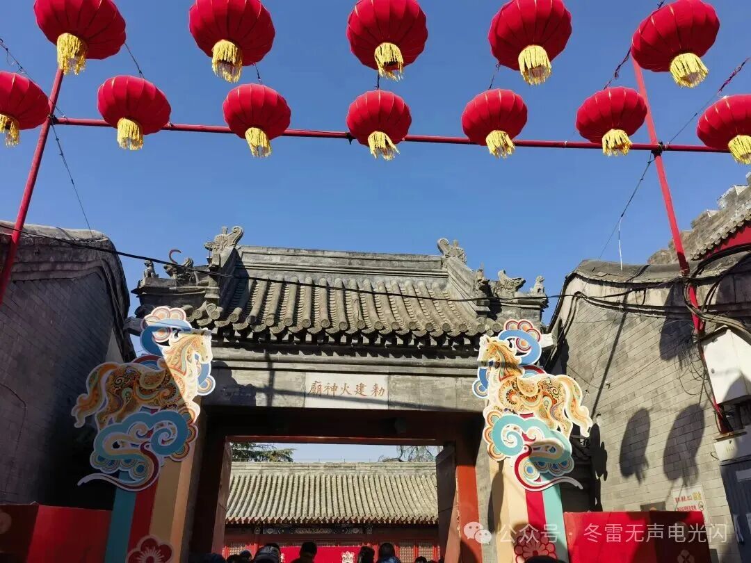 如今这里仍然是庙会的主要活动场所之一。火神庙坐北朝南,山门门楣有“敕建火神庙”金字。据《北平庙宇通检》记载,民国初年,北京城内有17座火神庙,用于供奉火神、避免火灾。其中,什刹海火神庙(建于唐贞观六年632年)、东城花市火神庙(建于明隆庆二年1568年)和琉璃厂火神庙并称京城三大火神庙,香火最旺。今年火神庙内设置了飞花令、猜谜等互动游戏,市民凭“银票通”(通过对诗、问答获取)可兑换文创礼品。