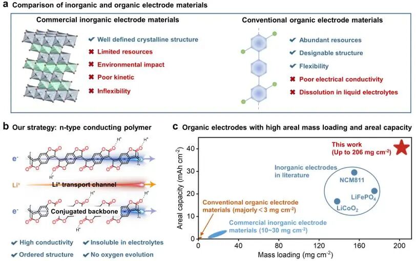 相比之下,有机电极材料来源广泛、结构可设计、具有本征柔韧性,被视为下一代绿色电池的理想候选材料。然而,其本征导电性差,面临难以实现高负载电极制备等问题,长期制约其实用化进程。