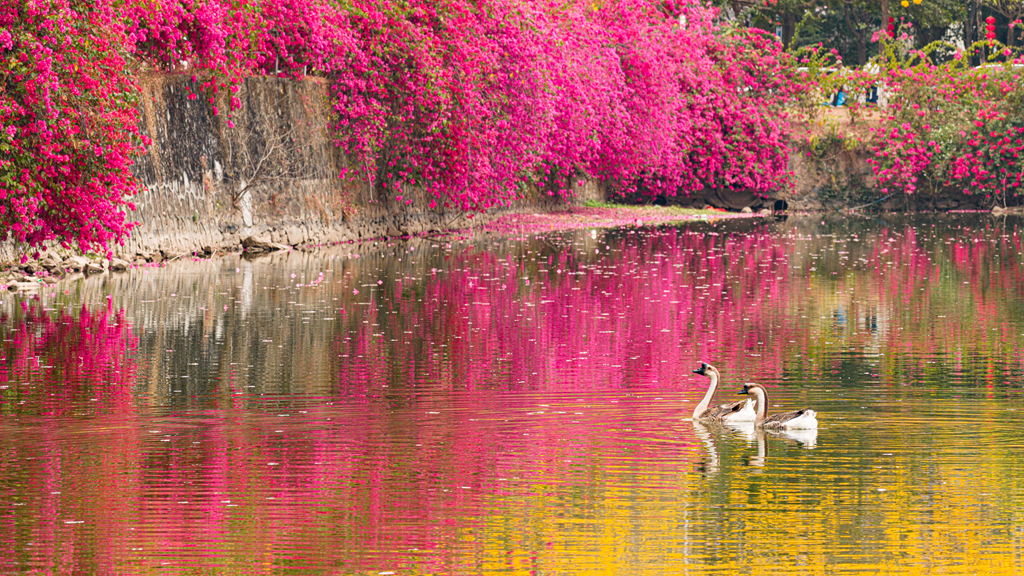 明黄与艳红在水岸相拥