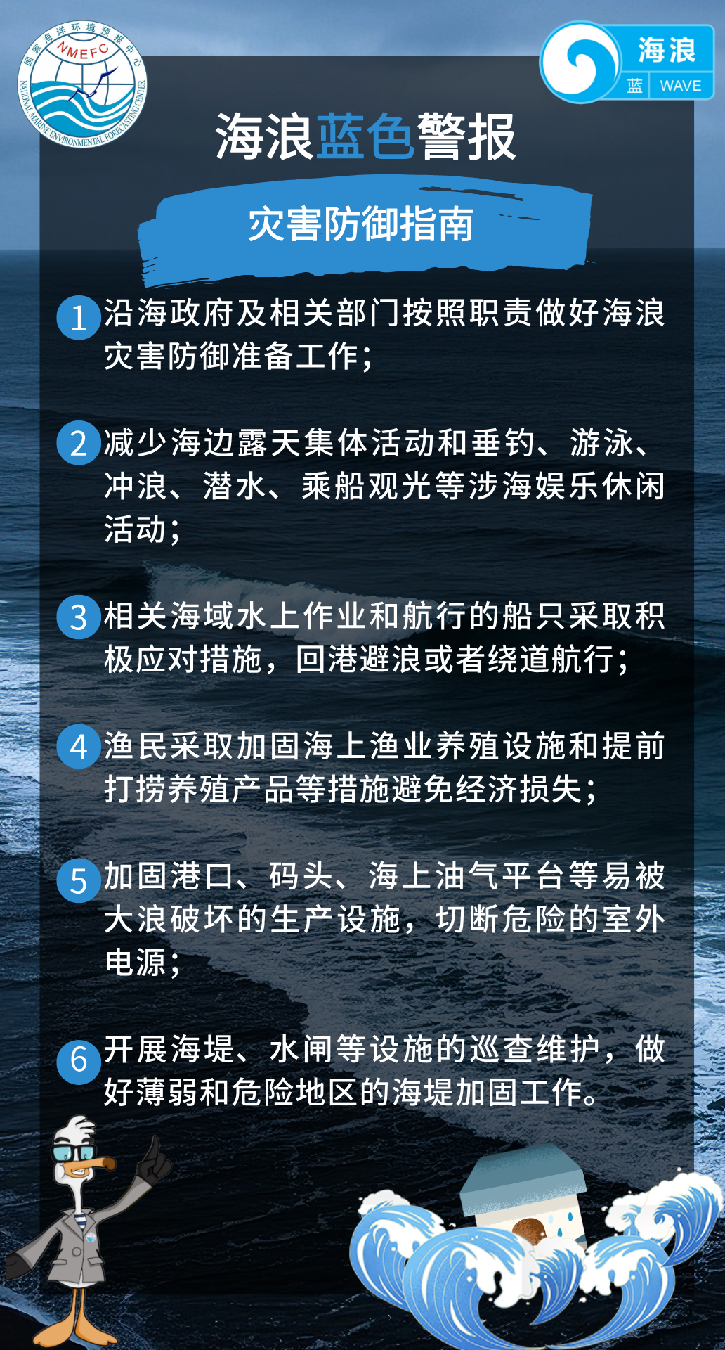 国家海洋预报台根据《海洋灾害应急预案》,今天下午发布海浪蓝色警报。