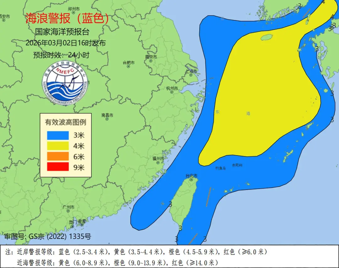上海、浙江、福建近岸海域将出现2到3米的中浪到大浪,近岸海域海浪预警级别为蓝色。