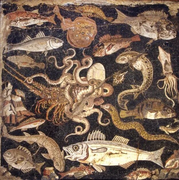 因为靠近地中海,鱼虾贝类在经济能力允许的人群中尤为受欢迎。鲣鱼、沙丁鱼、鳗鱼、牡蛎等等,是这些罗马家庭餐桌上的常客。