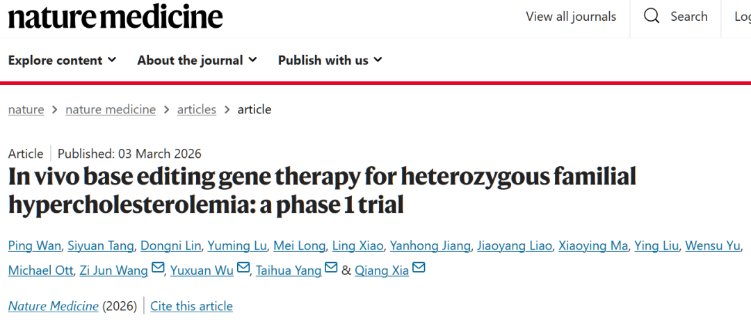 [1]Wan, P., Tang, S., Lin, D. et al. In vivo base editing gene therapy for heterozygous familial hypercholesterolemia: a phase 1 trial. Nat Med (2026). https://doi.org/10.1038/s41591-026-04254-4