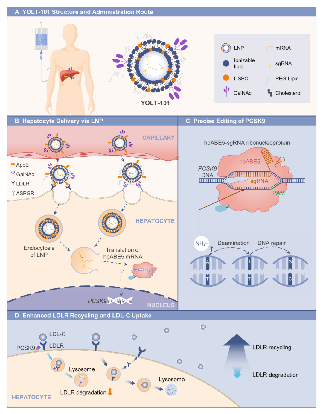 YOLT-101是一种以脂质纳米颗粒(LNP)为载体、靶向肝脏PCSK9的腺嘌呤碱基编辑器。该药物由我国药企尧唐生物(YolTech Therapeutics)自主研发,上海交通大学医学院附属仁济医院团队开展了其1期临床研究。这一试验的中期数据已于2025年欧洲动脉粥样硬化学会年会(EAS 2025)上初步报告,论文发表在medRxiv,今日正式发表于《自然·医学》。
