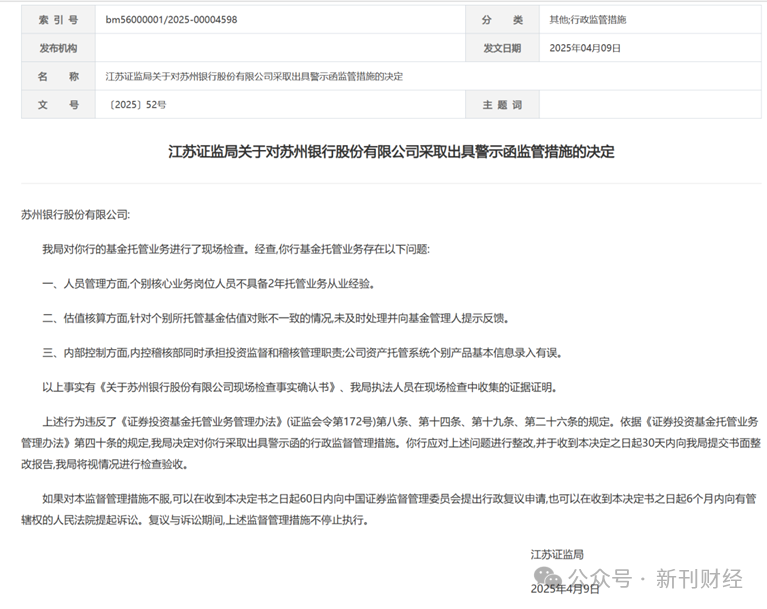 近几年,苏州银行风控体系问题频发:2024年因项目贷款“三查”不到位、数据治理违规等被罚170万元;2025年4月,因基金托管业务现场检查存在人员管理、估值核算、内部控制等问题,被监管出具警示函;7月东海支行因“存贷挂钩”被罚30万元;连云港分行因信用证贸易背景审查不严被罚25万元……内控缺陷贯穿从基层至总行的全链条。