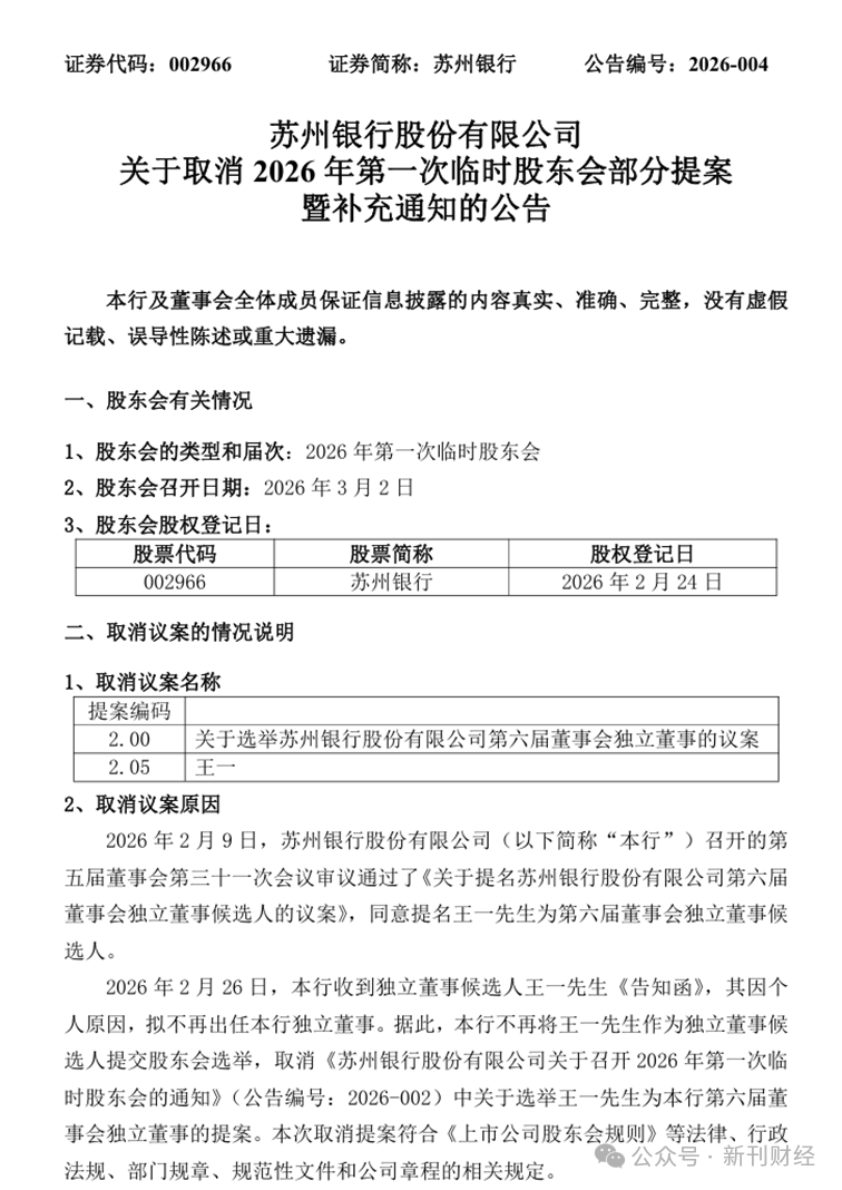 2026年2月26日,苏州银行发布公告取消独立董事候选人王一的选举提案。王一曾任职于证监会上海证监局,具备扎实的资本市场合规与风险管控专业素养。他在距离临时股东会召开仅四天时以“个人原因”突然退出,导致苏州银行新一届董事会独董占比不足三分之一,触碰《上市公司独立董事管理办法》的合规底线。这种“非常规”动作引发外界关注,在苏州银行冲击万亿资产规模的关键节点,暴露出其深层次的发展隐忧。