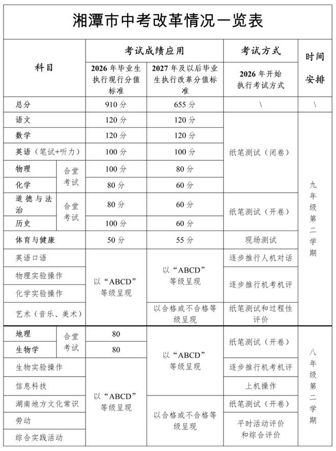 (记者 鲁婷 通讯员 黄彪)地理、生物学退出计分,转为等级呈现;“小四门”全开卷……3月4日,市教育局发布《湘潭市深入推进中考改革工作实施方案》,明确从2024年秋季入学的七年级学生(即2027年毕业生)起,正式实施新的中考政策。2026年初三毕业生仍按原方案执行。