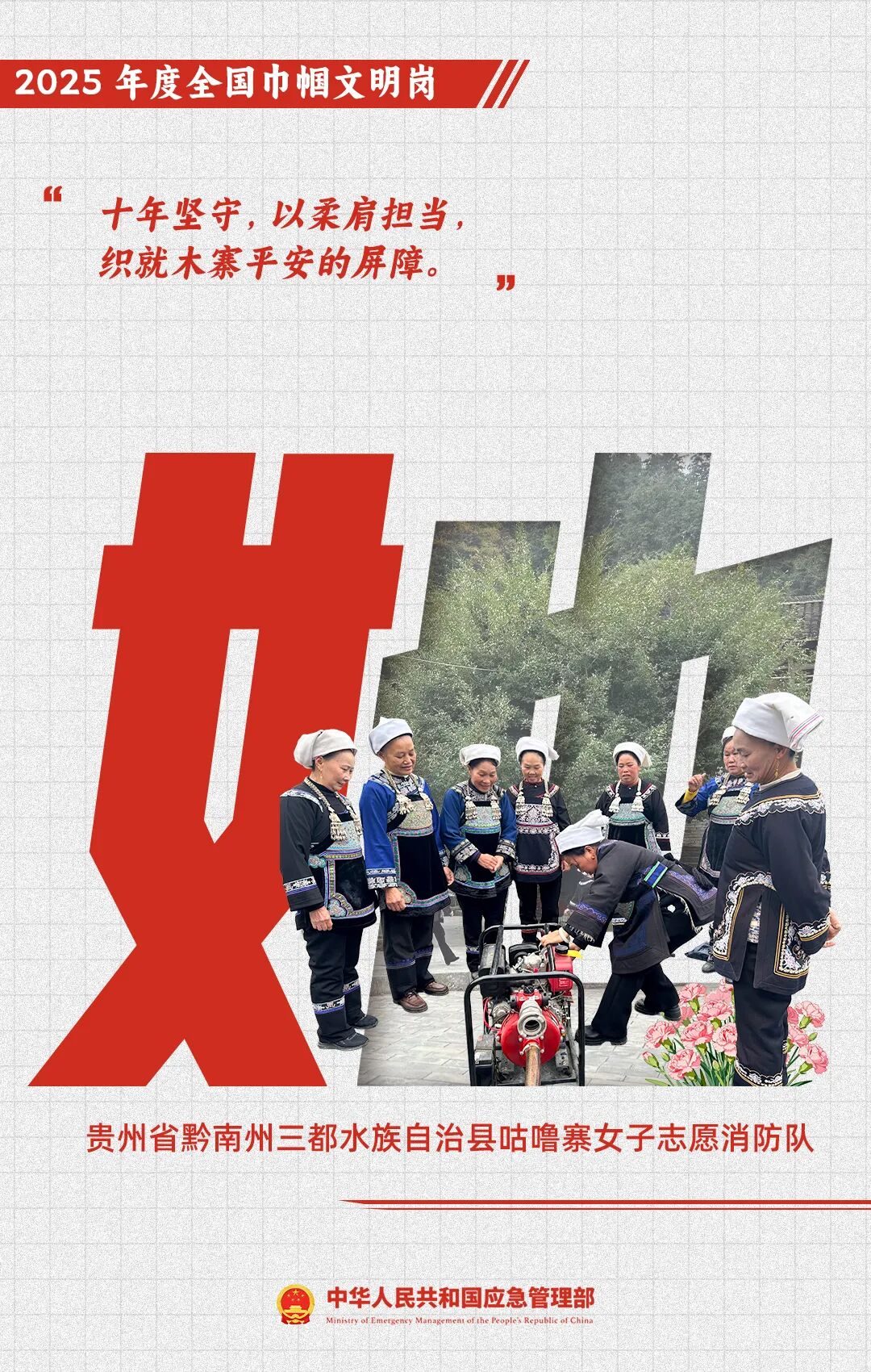 贵州省黔南州三都水族自治县咕噜寨女子志愿消防队获评“2025年度全国巾帼文明岗”称号。这支由10名平均年龄50岁的妇女组成的志愿消防队,自2014年建队以来,巡寨查患、佳节值守,用水语宣传消防知识,以专业练灭火技能,十余年坚守创造了多年火灾“零事故”的佳绩。这群留守妇女,用脚步丈量平安,用乡音传递温暖,于烟火村寨间筑就安全屏障,以无声奉献诠释最美“她力量”。