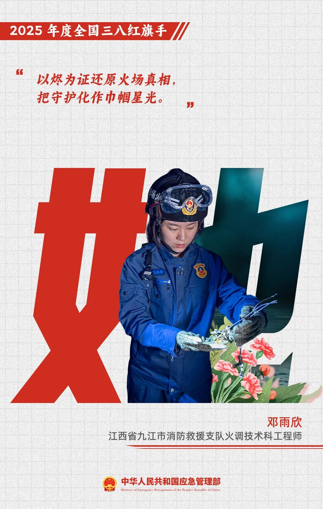 邓雨欣同志获评“2025年度全国三八红旗手”称号。她深耕火灾调查一线13年,参与300余起事故调查,用科学与细致,在残垣断壁中寻找真相的蛛丝马迹。她打造的“开学第一课”“废墟上的课堂”“火因小推理”三大特色宣传课程,让消防知识走进千家万户。她成立的江西首个火调工作室,培养了10余名模块化专长人才,研发5项国家专利成果,斩获全国大赛二等奖、江西省科学技术进步奖二等奖。多年来,她的初心从未改变:让废墟开口说话,让真相照亮前路;让消防知识守护万家,国泰民安。