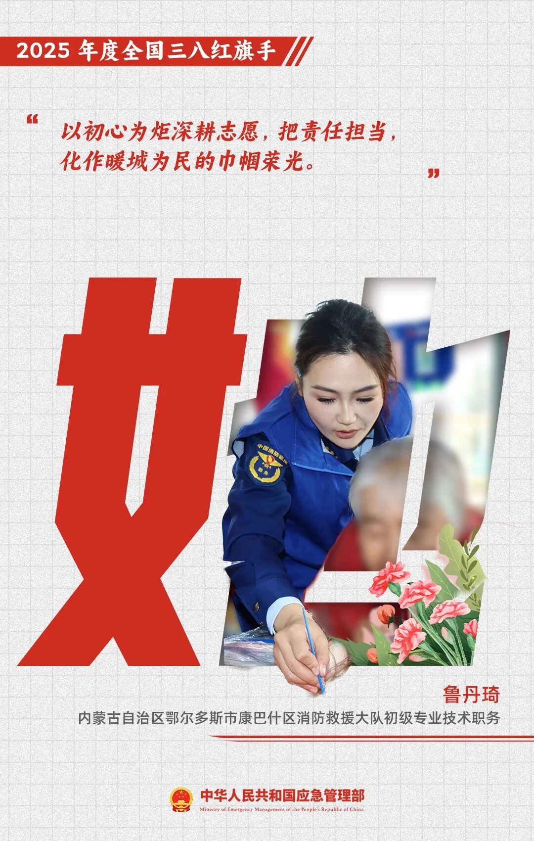 鲁丹琦同志获评“2025年度全国三八红旗手”称号。她是汶川震区里昼夜鏖战,逆行出征的巾帼蓝焰先锋,更是为民服务、率先垂范的党员标杆,她坚守 “人民至上、生命至上” 的崇高理念,以志愿深耕诠释 “助人为乐、甘于奉献” 的时代品格,用“火焰蓝”的执着坚守传递巾帼蓝焰的温暖力量,让为民服务的种子在暖城遍地开花。