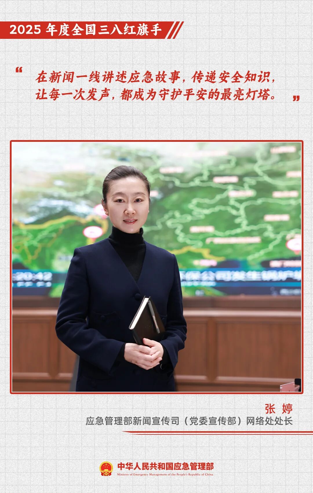 张婷同志获评“2025年度全国三八红旗手”称号。她深耕新闻宣传一线,以笔为媒、以网为桥,策划开展“新征程上看应急”“追梦火焰蓝”“全民安全公开课”等宣传活动,讲述应急故事,传递安全知识,带动千万网民共筑安全防线。她常年参加24小时应急值守,在甘肃积石山地震、陕西商洛高速公路桥梁垮塌等灾害事故中,闻令而动、连续作战,发布权威信息,回应社会关切,以实干诠释担当,用坚守与热爱守护万家平安。