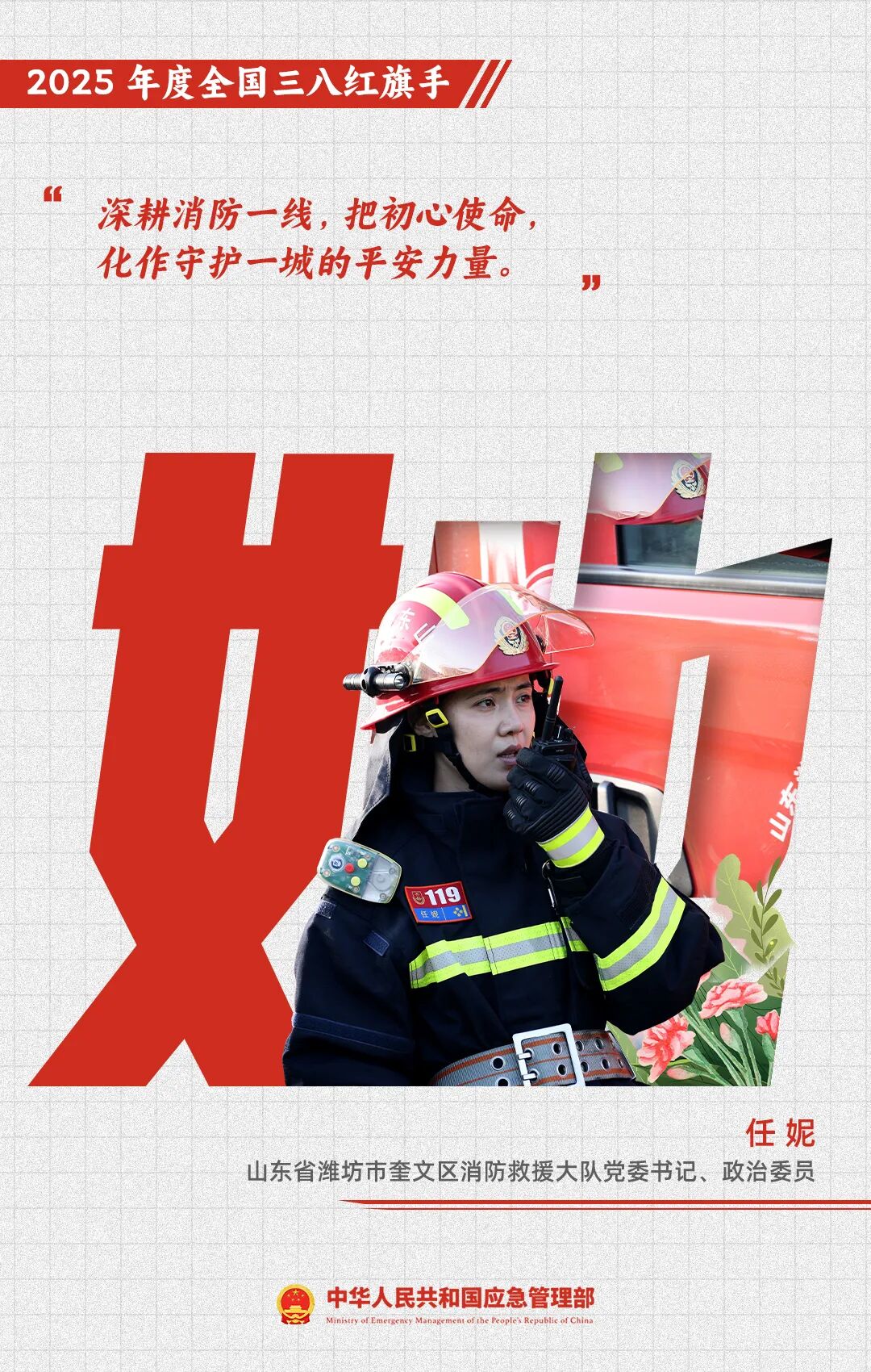 任妮同志获评“2025年度全国三八红旗手”称号。作为一名奋战在基层大队的消防女主官,18年来,她带队处置各类灾害事故1746起,营救被困群众126人,保护群众财产价值2280余万元。2024年12月,辖区汽配城突发大火,浓烟翻滚、险情重重,任妮第一时间到场,科学研判、果断调度,带领队员突破火点、打通生命通道,成功救出9名被困群众,避免重大伤亡。“消防员平安归队、群众生命安全,就是我最大的责任。”这句朴素的话,是她向险而行的不变初心。