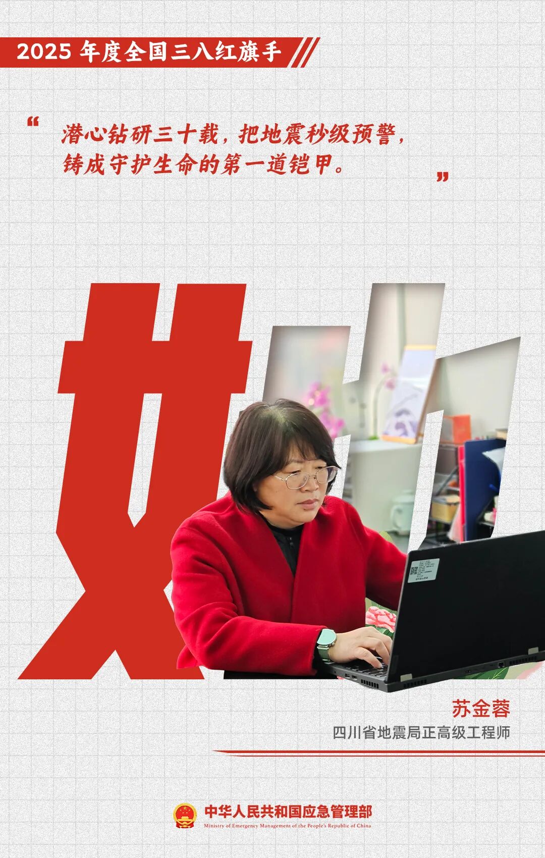 苏金蓉同志获评“2025年度全国三八红旗手”称号。她深耕地震监测预警30年,牵头建立四川震例库,创新提升地震定位精度,引入人工智能技术让余震编目效率提升300%,参与75次破坏性地震应急。她带领团队率先实现四川秒级地震预警,泸定地震中6.2秒发出预警。她还培养出一批青年技术骨干,将“人民至上”的信念融入每一次技术迭代。30年来,她带领团队在地震监测预警的“生死时速”中,书写了“人民至上、生命至上”的时代答卷。