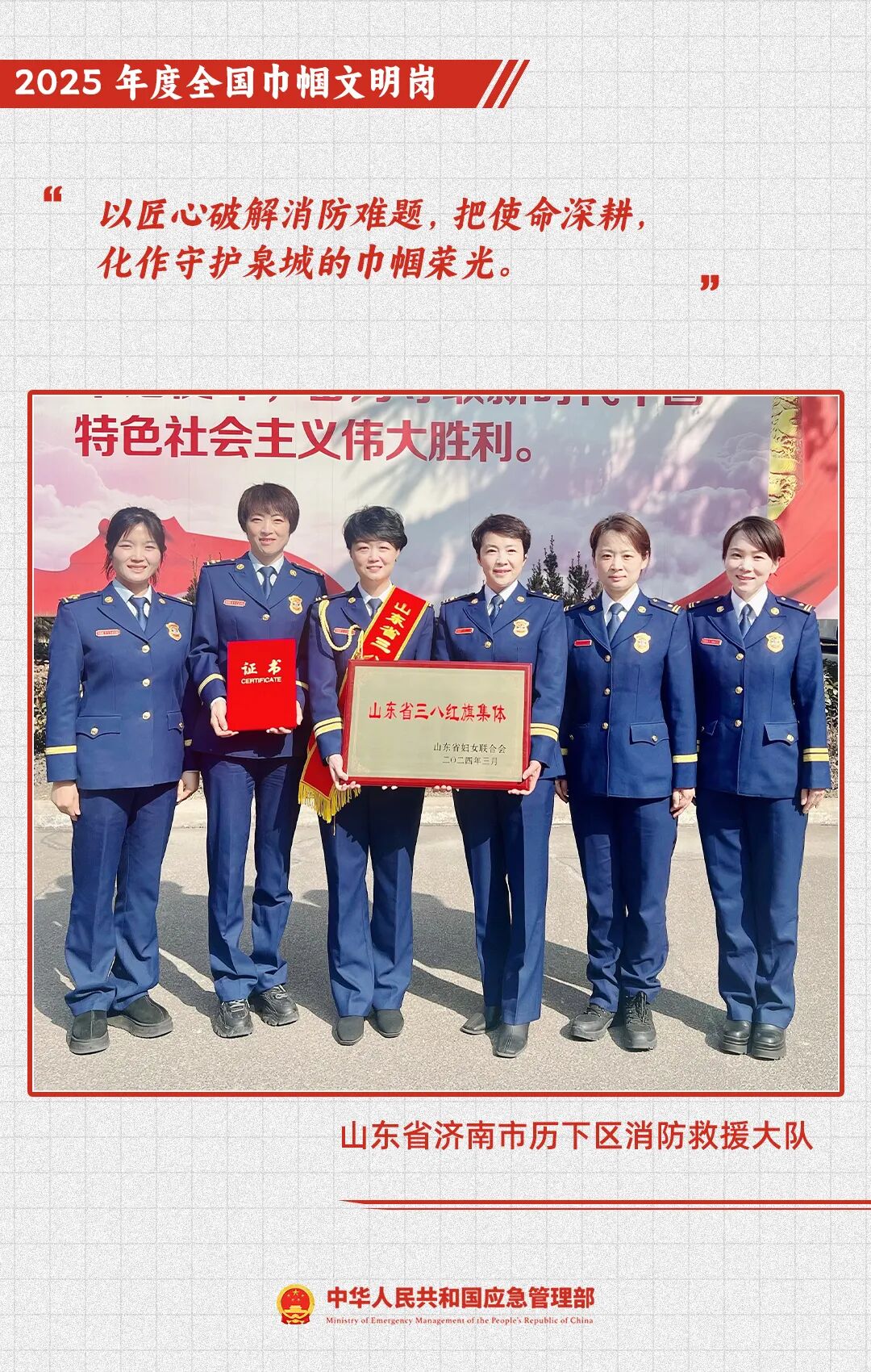 山东省济南市历下区消防救援大队获评“2025年度全国巾帼文明岗”称号。她们扎根济南中心城区消防一线,担负着监督执法、火调调度、宣传培训等责任。组建“蓝玫瑰”巾帼服务队、破解消防服务难点堵点、创新消防培训演练模式……这群巾帼指战员以专业为刃、以坚守为盾,将“她”力量融入泉城平安建设,使“巾帼文明之花”在火焰蓝中持续绽放。
