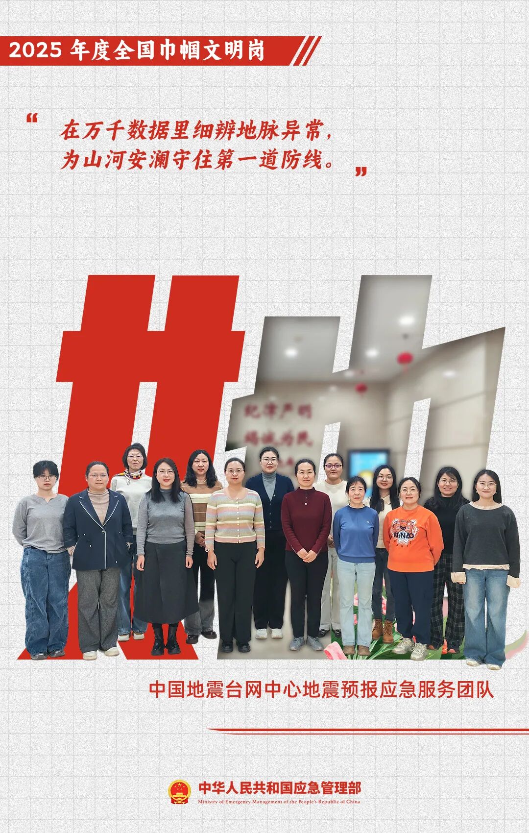 中国地震台网中心地震预报应急服务团队获评“2025年度全国巾帼文明岗”称号。她们扎根地震预测预报一线,以女性特有的细致、坚韧与严谨,扛起防震减灾重要职责。日常工作中,她们分析数据、核实异常,探索地震孕育规律;地震发生后,她们闻令而动、快速响应,第一时间开展震情会商、趋势判定,为政府科学决策、应急处置提供坚实科学依据和技术支撑。