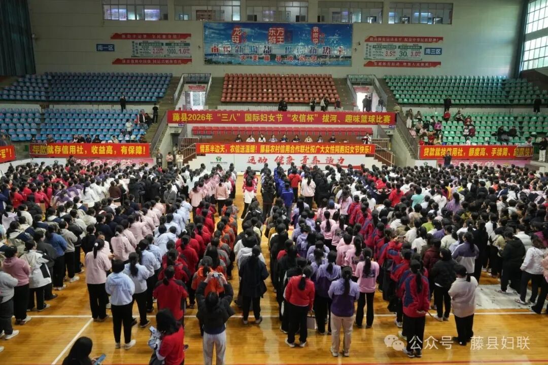 活力绽放,彰显巾帼昂扬风采。3月6日,藤县“跟党奋进新征程 巾帼建功新时代”2026年“三八”国际妇女节“农信杯”拔河、趣味篮球比赛在县体育馆隆重举行。来自各乡镇、县各单位及社会团体的76支参赛队伍、1100余名女性健儿齐聚赛场,用拼搏致敬节日。上午的拔河比赛,场上的呐喊声、加油声此起彼伏,用坚韧诠释集体力量;下午的趣味篮球比赛接续开赛,选手们默契配合、灵活穿梭、精准投篮,在欢声笑语中尽显运动风采。不同年龄、不同行业的女性同胞以赛会友,在竞技中释放活力,在协作中凝聚情谊。