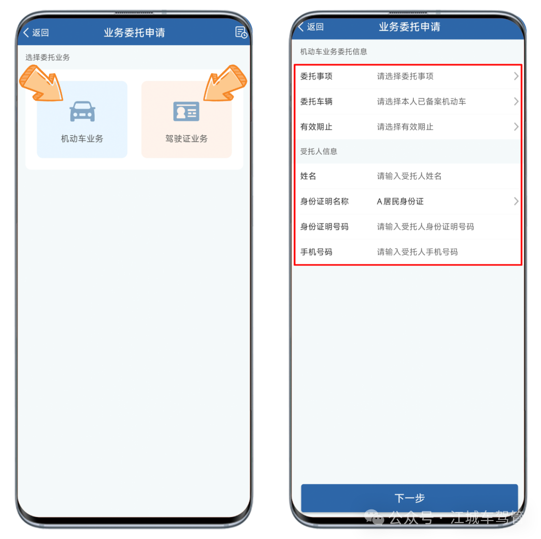 选择委托业务类型,点击【机动车/驾驶证业务】,填写业务委托信息和委托人信息,点击【下一步】。
