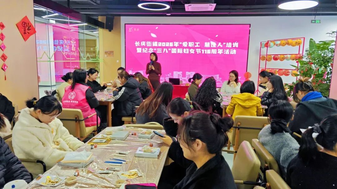 长庆街道“爱职工 慧佳人”培训暨纪念“三八”国际妇女节116周年活动在东清商务社区党群服务中心温情启幕,约80名辖区女性职工参加。现场设置马年金丝宝石画制作、眼科与医美义诊服务以及睡眠体验,并同步举办“三八超级美丽内购会”。大家在手作中陶冶情操,在服务中关注健康,在购物中收获愉悦,充分展现新时代女性自信优雅、积极向上的精神风貌。长庆街道妇联、长庆街道总工会和东清商务社区将持续搭建多元服务平台,用心用情绘就女性发展最美“同心圆”。