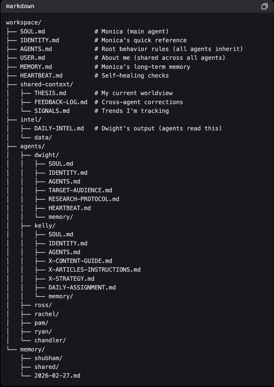 智能体之间协调不调用API,也不使用消息队列,只用文件通信。研究智能体Dwight将调研结果写入intel/DAILY-INTEL.md, Kelly、Rachel、Pam会直接读取。它们之间的交接,就只靠磁盘上的Markdown文件。