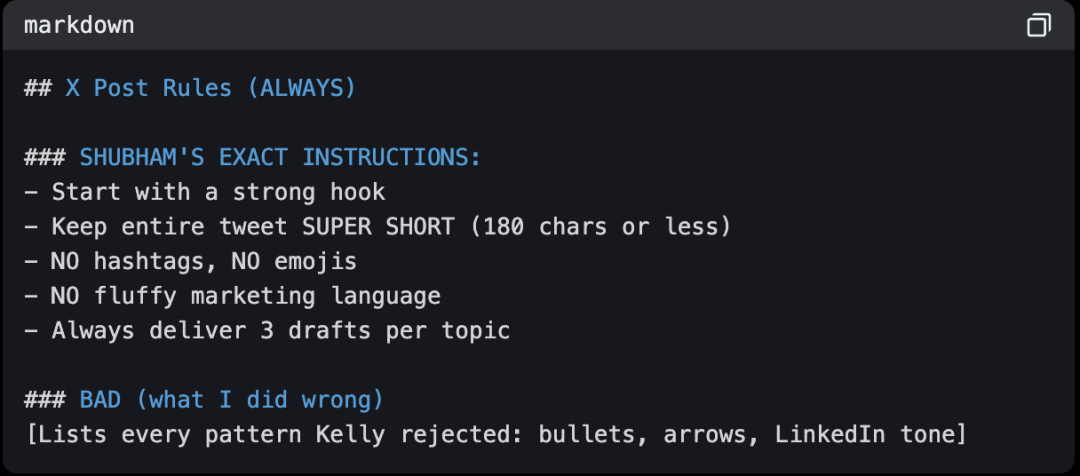 推文写作智能体Kelly在多次修正后,会自己写下错误示例,将自己犯过的错整理成清单。