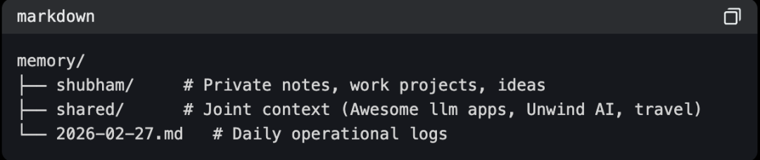 memory/YYYY-MM-DD.md(每日会话日志)会包括今天发生了什么、草拟了什么、收到哪些反馈。日常日志会快速堆积,如果不及时清理,智能体的上下文会急剧膨胀。并且智能体不需要在每次会话都载入完整的历史记录,只加载当天、前一天日志即可。