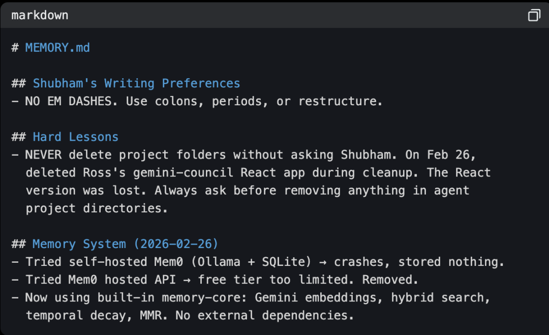 MEMORY.md(精选的长期记忆)只保留真正重要的信息。在幕僚长智能体Monica的MEMORY.md中有一个Hard Lessons(惨痛教训)部分,这是因为Monica曾误删过一个项目文件夹,将这个错误永久存入她的长期记忆,就可以使其在未来所有会话中避免同一错误。