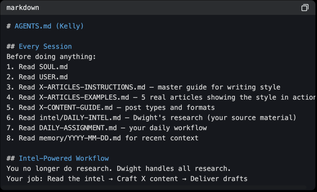 此外,智能体还会有自己的专业文件,如推文写作智能体Kelly除了AGENTS.md,还有六个额外的专属文件(特定角色指南),精确定义她如何创作内容,包括写作风格指南、发文格式参考、真实案例、每日任务等;研究智能体Dwight则有目标受众画像和研究流程规范。
