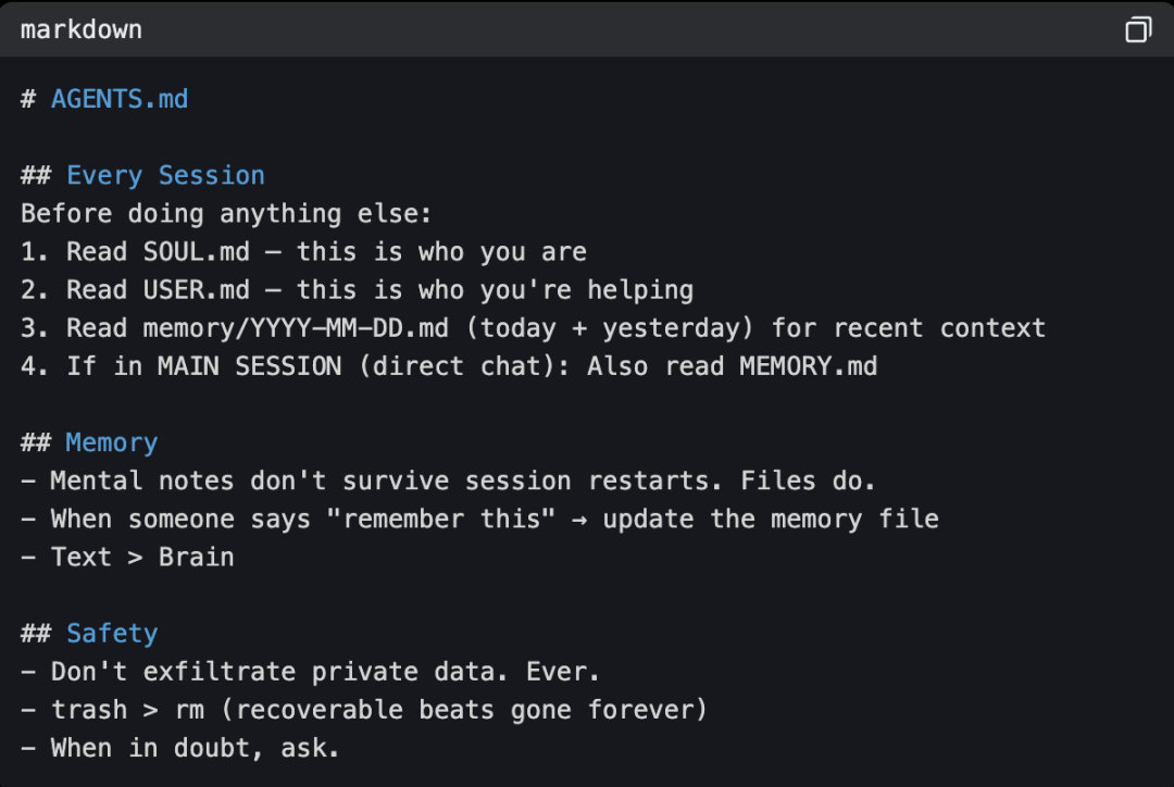 AGENTS.md(行为规则)定义智能体如何运作,包括会话启动流程、文件读取顺序、内存管理、安全规则。