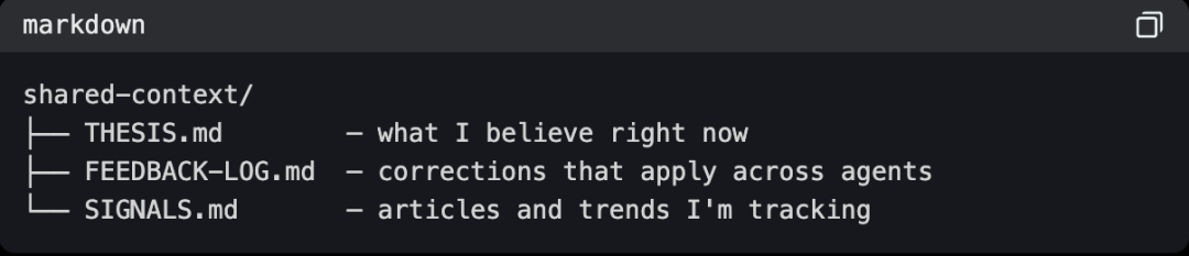 Saboo在第20天的时候构建了THESIS.md和FEEDBACK-LOG.md,使其对某个智能体修正一次就可以同步到所有地方。