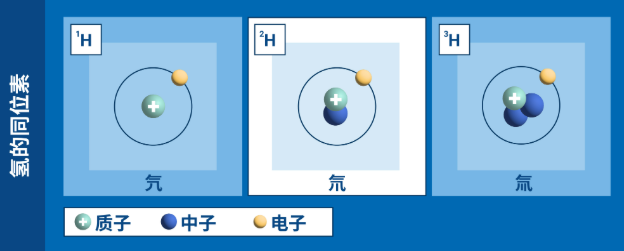 例如大家常听到的用来进行核聚变的原料氘和氚,其实它们都是氢元素,不同的就是内部的中子数,0 中子的是氢、中子数为1的是氘、中子数为2的是氚。