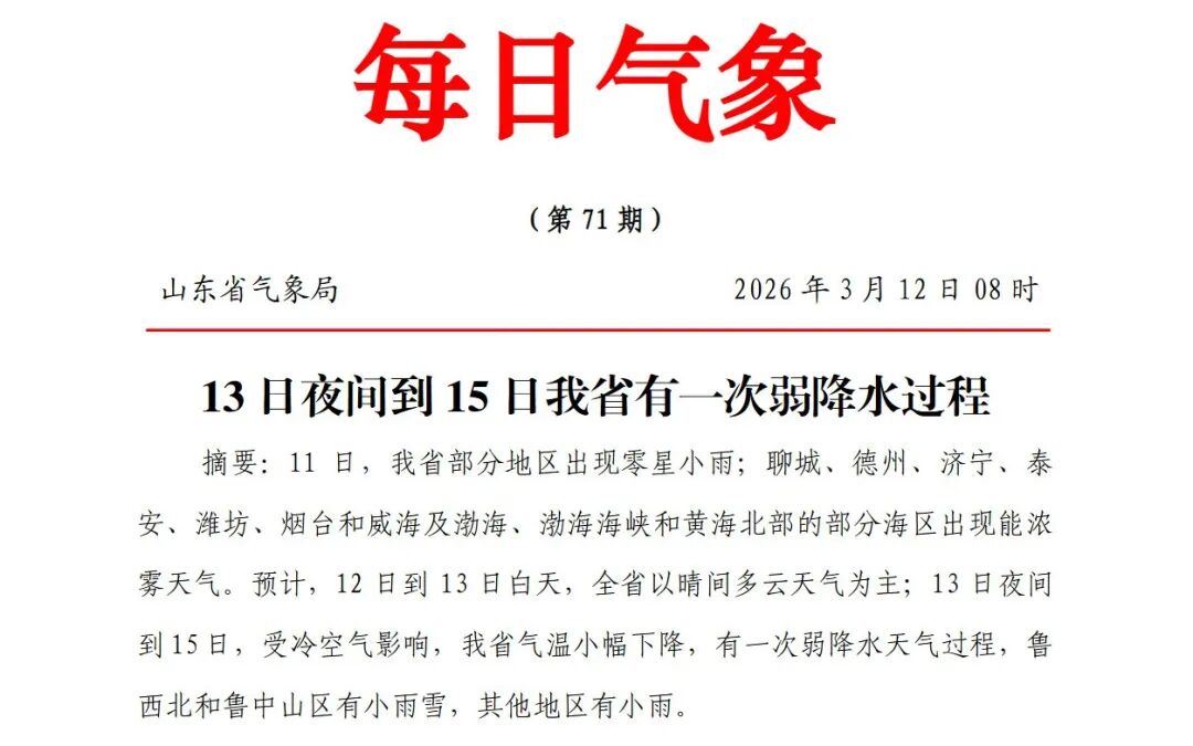 13日白天到夜间,鲁西北地区天气多云转阴有小雨,其他地区天气晴转多云。鲁西北地区南风3~4级转北风4级阵风5~6级,其他地区南风转北风3~4级。
