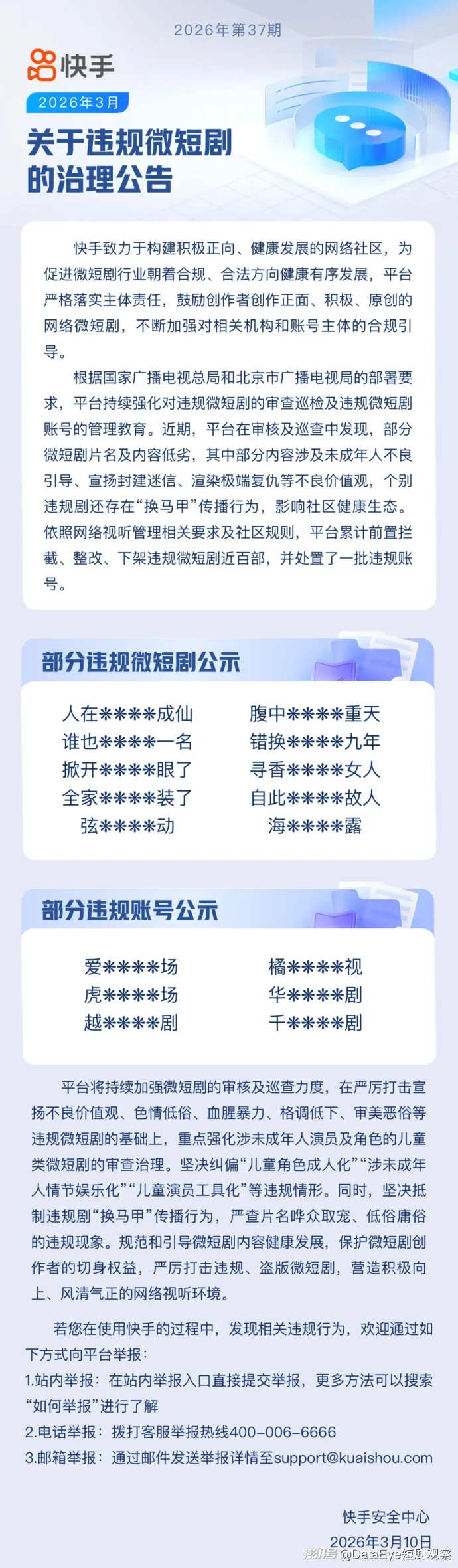 近期,平台在审核及巡查中发现,部分微短剧片名及内容低劣,其中部分内容涉及未成年人不良引导、宣扬封建迷信、渲染极端复仇等不良价值观,个别违规剧还存在“换马甲”传播行为,影响社区健康生态。依照网络视听管理相关要求及社区规则,平台累计前置拦截、整改、下架违规微短剧近百部,并处置了一批违规账号。