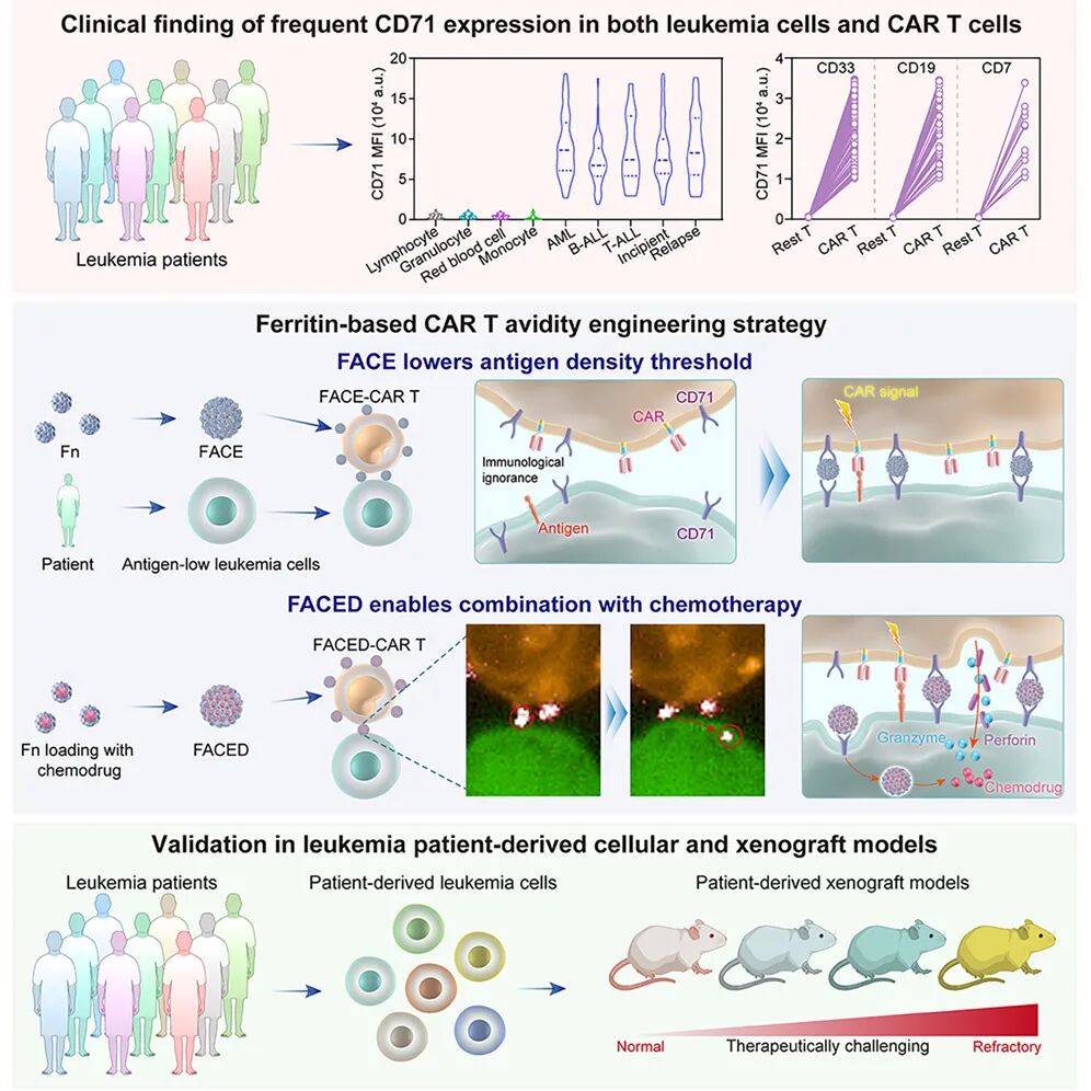 面对这一挑战,研究团队另辟蹊径,从临床样本中寻找共性。他们系统分析了大量来自B细胞急性淋巴细胞白血病、T-ALL及急性髓系白血病患者的骨髓样本,并检测了针对CD19、CD7、CD33等不同靶点的CAR-T细胞。一个关键发现浮出水面:无论是多种类型的白血病细胞,还是对应的CAR-T细胞,都持续、稳定地高表达一种名为CD71的蛋白(转铁蛋白受体)。这提示CD71可能成为一个理想的通用“锚点”,用于构建连接两种细胞的分子桥梁。