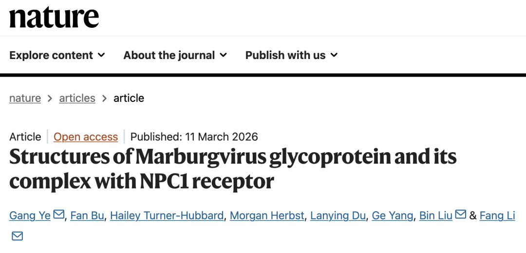 3 月 11 日,明尼苏达大学李放、Liu Bin 作为共同通讯作者,Ye Gang 作为共同第一作者兼共同通讯作者,Bu Fan 作为共同通讯作者,在 Nature 期刊发表了题为:Structures of Marburgvirus glycoprotein and its complex with NPC1 receptor(马尔堡病毒糖蛋白及其与 NPC1 受体复合物的结构)的研究论文【1】。