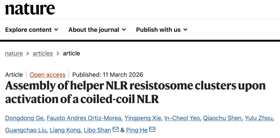 3 月 11 日,德州农工大学何平、单立波作为共同通讯作者,Ge Dongdong、Xie Yingpeng 作为共同第一作者,在 Nature 期刊发表了题为:Assembly of helper NLR resistosome clusters upon activation of a coiled-coil NLR(卷曲螺旋 NLR 激活后辅助 NLR 抗病小体簇的组装)的研究论文【4】。