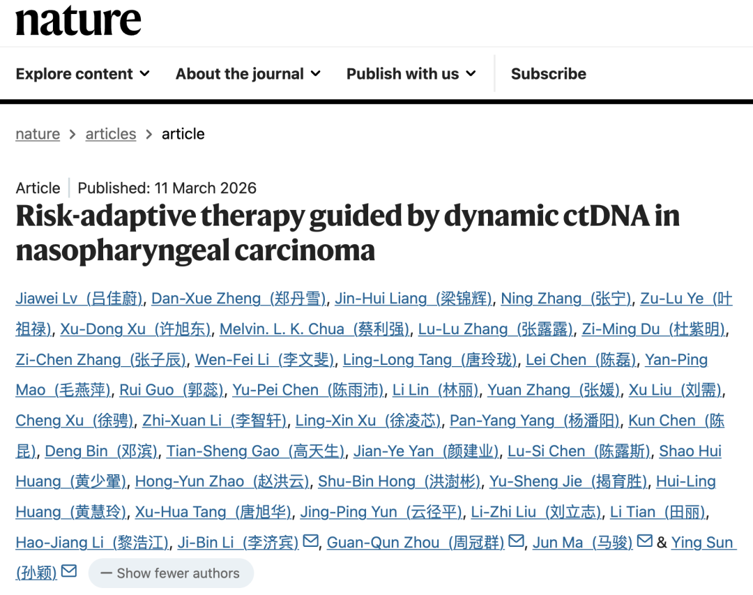 3 月 11 日,中山大学肿瘤防治中心孙颖、马骏、周冠群、李济宾作为共同通讯作者,吕佳蔚、郑丹雪、梁锦辉、张宁、叶祖禄、许旭东、蔡利强作为共同第一作者,在 Nature 期刊发表了题为:Risk-adaptive therapy guided by dynamic ctDNA in nasopharyngeal carcinoma(基于动态循环肿瘤 DNA 的鼻咽癌风险适应性疗法)的研究论文【7】。
