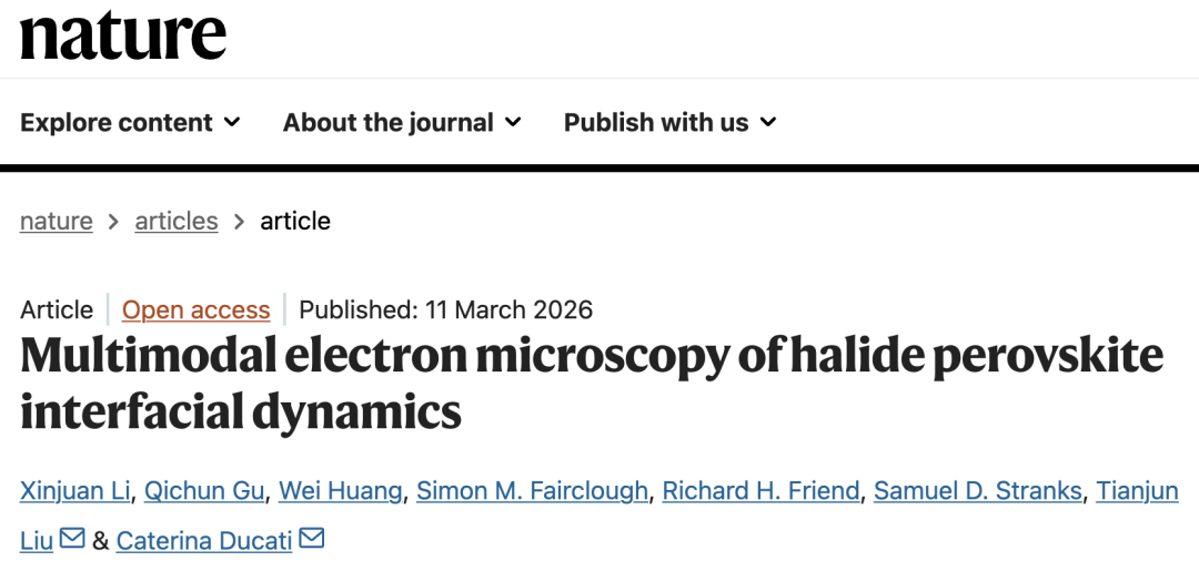 3 月 11 日,剑桥大学 Liu Tianjun 作为共同通讯作者,Li Xinjuan 作为第一作者,在 Nature 期刊发表了题为:Multimodal electron microscopy of halide perovskite interfacial dynamics(卤化物钙钛矿界面动力学的多模态电子显微镜研究)的研究论文【2】。