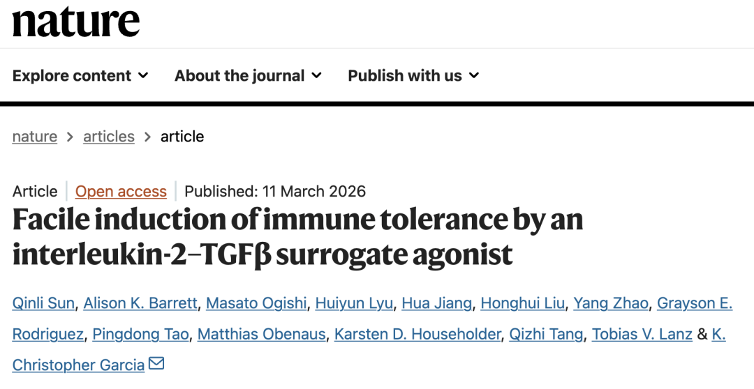 3 月 11 日,斯坦福大学医学院孙勤利作为第一作者,在 Nature 期刊发表了题为:Facile induction of immune tolerance by an interleukin-2–TGFβ surrogate agonist(IL-2-TGFβ 替代激动剂简单诱导免疫耐受)的研究论文【3】。