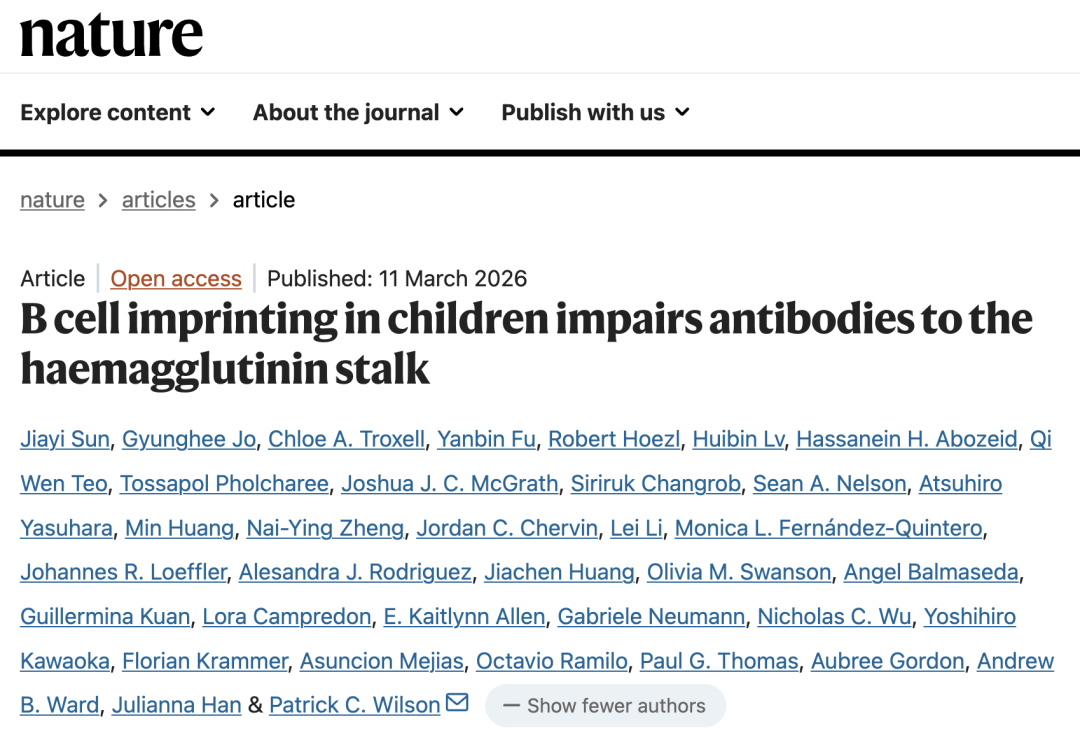 3 月 11 日,威尔康奈尔医学院孙佳毅作为第一作者,在 Nature 期刊发表了题为:B cell imprinting in children impairs antibodies to the haemagglutinin stalk(儿童 B 细胞印记会损害针对血凝素茎部的抗体)的研究论文【5】。