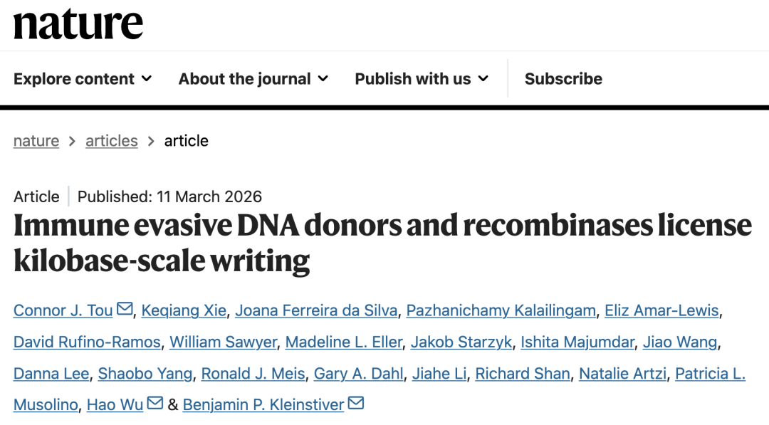 3 月 11 日,Full Circles 公司吴昊作为共同通讯作者,谢克强作为共同第一作者,在 Nature 期刊发表了题为:Immune evasive DNA donors and recombinases license kilobase-scale writing(免疫逃逸 DNA 供体和重组酶实现千碱基规模的基因写入)的研究论文【6】。