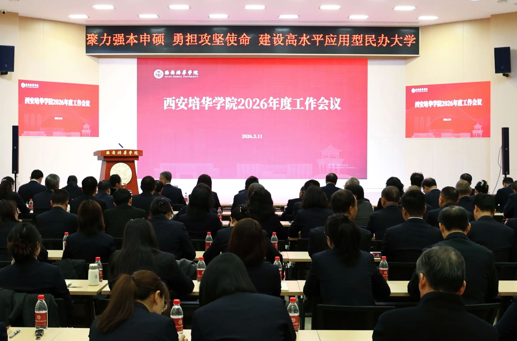 3月11日下午,西安培华学院2026年工作会议在长安校区召开。会议旨在深入学习全国、全省教育工作会议精神,贯彻落实陕西教育强省建设要求,全面部署2026年重点工作,进一步统一思想、凝聚共识,为推进“强本申硕”战略攻坚和高质量发展谋篇布局。全体校级领导、中层干部,各基层党组织负责人,各教学单位办公室主任、系主任、专业带头人,教师代表及相关职能部门骨干共200余人参加会议。校党委书记刘锋主持会议。