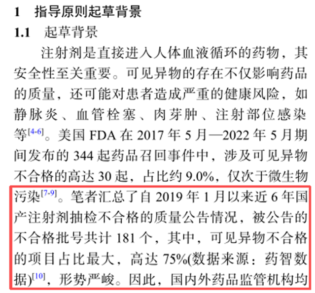 笔者梳理发现,可见异物问题在医药行业并非新鲜事。《中国药典2025年版注射剂可见异物控制指导原则解读》中汇总了自2019年1月以来近6年国产注射剂抽检不合格的质量公告情况,被公告的不合格批号共计181个。其中,可见异物不合格的项目占比最大,高达75%。